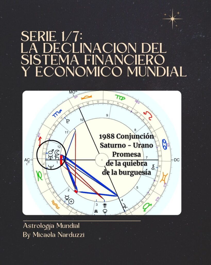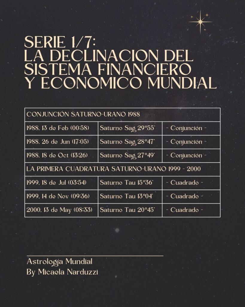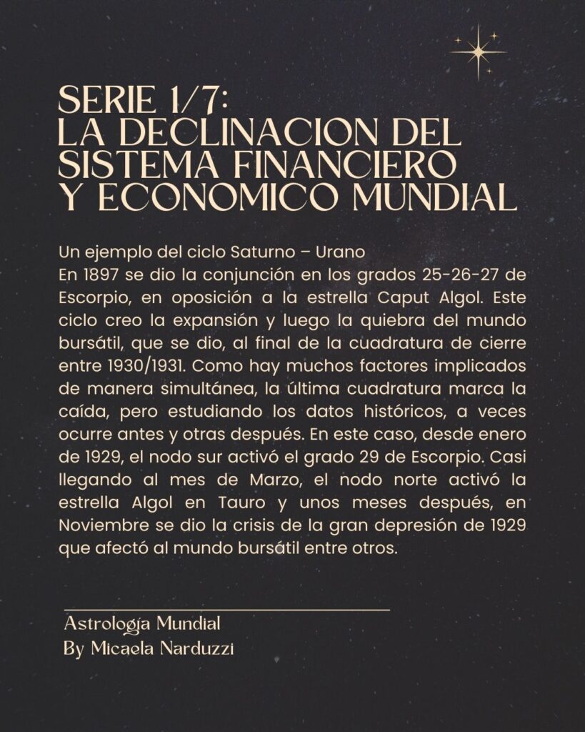 En 1897 se dio la conjunción en los grados 25-26-27 de Escorpio, en oposición a la estrella Caput Algol. Este ciclo creo la expansión y luego la quiebra del mundo bursátil, que se dio, al final de la cuadratura de cierre entre 1930/1931. Como hay muchos factores implicados de manera simultánea, la última cuadratura marca la caída, pero estudiando los datos históricos, a veces ocurre antes y otras después. En este caso, desde enero de 1929, el nodo sur activó el grado 29 de Escorpio. Casi llegando al mes de Marzo, el nodo norte activó la estrella Algol en Tauro y unos meses después, en Noviembre se dio la crisis de la gran depresión de 1929 que afectó al mundo bursátil entre otros.