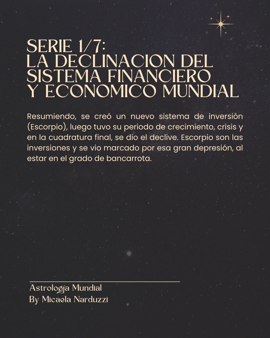 Resumiendo, se creó un nuevo sistema de inversión (Escorpio), luego tuvo su periodo de crecimiento, crisis y en la cuadratura final, se dio el declive. Escorpio son las inversiones y se vio marcado por esa gran depresión, al estar en el grado de bancarrota.